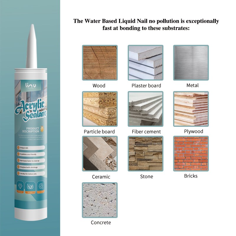 The water based laiquid nail is no pollution, and it is exceptionally fast at bonding to these substrates: wood, plaster board, metal, particle board, fiber cement, plywood, ceramic, stone, bricks, concrete.